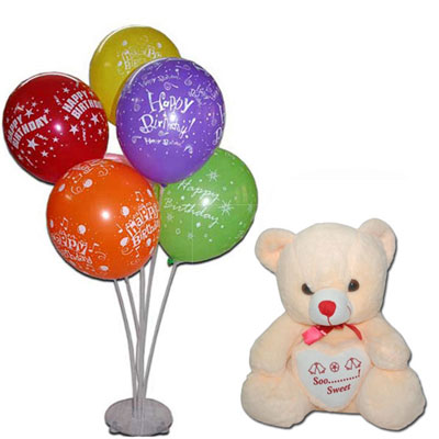 Cream Colour Teddy BST-13004-001 Height: 30cm + 7 Colourful Birthday blown balloons with stand NOTE: This is an add on item, to be ordered along with Order.