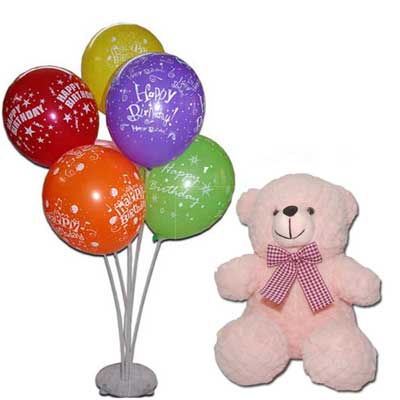 Pink Colour Teddy BST-13005-001 Height: 25cm + 7 Colourful Birthday blown balloons with stand NOTE: This is an add on item, to be ordered along with Order.