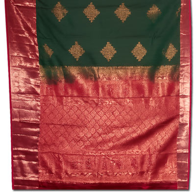 Kalaneta Green powerloom fancy pattu saree with contrast Maroon color fancy tested zaree Border, body arranged with buttas and Contrast pink color pallu compactly woven . Blouse piece Attached NOTE: Same day Delivery for Hyderabad and Secunderabad. For other places requires minimum 2 to 3 WORKING DAYS