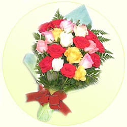 21 mixed roses flower bouquet along with fillers wrapped in 2 layers with white decorative paper and tied with Ribbon bow.