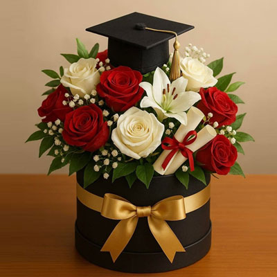 Beautiful Flower box with 10 Red Roses, 5 white Roses and 2 Asiatic Lilies along with fillers and decorated with miniature graduation hat and a certificate along with ribbon bow.
