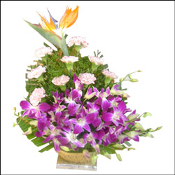Make your shining beauty swim in sea of smiles with this exotic basket of 9 Pink carnations, 8 Orchids and 1 Bird of Paradise.(Flowers are subject to availability).