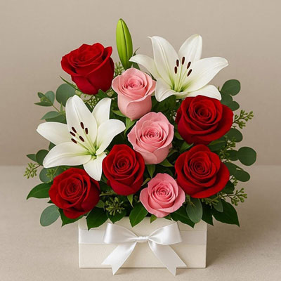 Red and Pink Roses with Asiatic Lilies Flower Box