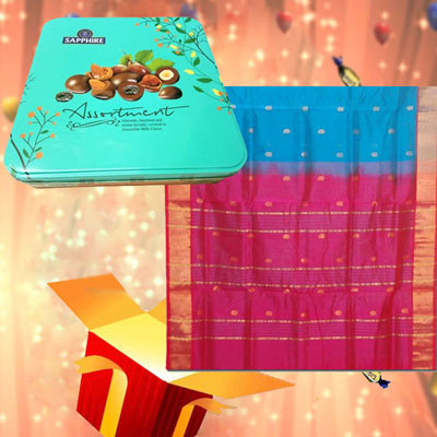 Celebrate special occasions by giving a thrilling surprise to your dear one with a gift which is hidden in the following way. Ananda blue color Venkatagiri cotton Silk (seico) Saree -HSNM-39 + SAPPHIRE ASSORTMENT, ALMONDS, HAZELNUTS AND RAISINS LAVISHLY COVERED IN IRRESISTIBLE MILK CHOCO. NET WEIGHT:200 GMS is hidden in a gift box and packed as a single Gift. NOTE: Same day Delivery for Hyderabad and Secunderabad. For other places requires minimum 2 to 3 WORKING DAYS