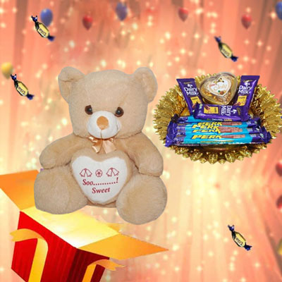 Celebrate special occasions by giving a thrilling surprise to your dear one with a gift which is hidden in the following way. Light Brown Colour Teddy BST-13004-001 Height: 30cm + Dairy milk Crackle chocolates -3 bars + Perk chocolates -5 bars + Sapphire Hazel fills heart shape chocolate 3pieces box + Gold colour designer tray is hidden in a Gift Box and packed as a single Gift. NOTE: Same day Delivery for Hyderabad and Secunderabad. For other places requires minimum 2 t