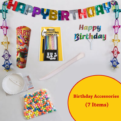 �Birthday Banner,Small Popper, Magical Candles, Birthday Knife, Paper Plates, Spoons, Paper Napkins, Decorative Canopy, Happy Birthday POP stand, Thermocol balls pack.
