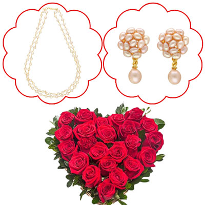 Lolita 2 Lines Pearl Necklace - JPAPL-23-29 Stone: freshwater pearls Shape: oval Colour: White Length: 18-20 Inches Closure Type: Hook + Elegance Drop Pearl Earrings - JPDEC-15- 43 Product Code: JPDEC-15-43 Stone: freshwater pearls Shape: oval Size: 4-5 MM Colour: Pink Closure Type Push Back + Beautiful heart shape flower arrangement with 30 Red roses NOTE: LEAD TIME FOR SHIPPING: 6 to 7 WORKING DAYS