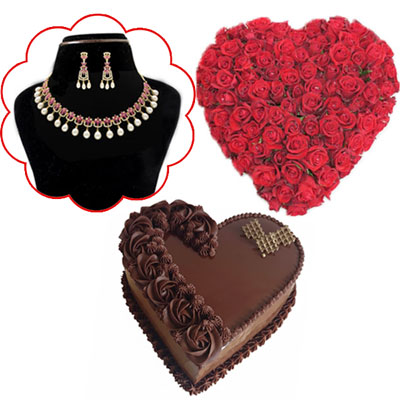 Fani 1 Line Pearl Necklace - JPAPL-23-20 Stone: freshwater pearls, color stones Shape: oval Colour: White Length: 16-18 Inches Closure Type: Hook + 60 Red roses Heart shape flower arrangement. + Heart shape designer chocolate cake - 1kg NOTE: LEAD TIME FOR SHIPPING: 6 to 7 WORKING DAYS