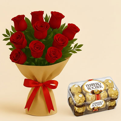 10 Red Roses Bouquet, 16 pcs Ferrero Rocher Chocolates Box