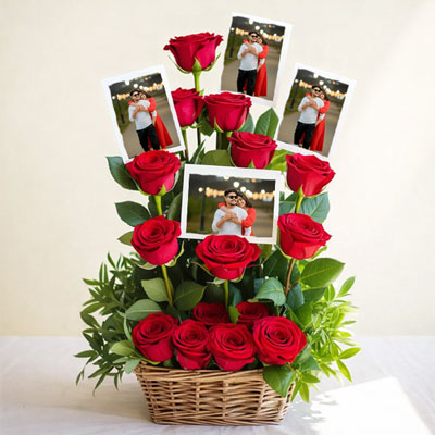 Beautiful Flower Basket with 15 Red Roses along with 4 Personalized Photos. Note: Deliveries only in Available Cities. please send high quality photo soft copy to the email id given below along with order id. support@us2guntur.com