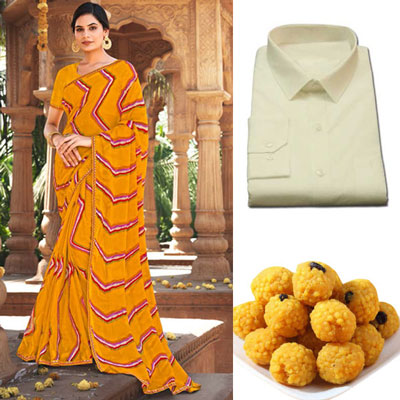 Fancy Silk Saree Seymore Kesaria -11367+Pure Cotton Shirt - CW20009-, Size: 42 + Laddu sweet - 500gms NOTE: Same day Delivery for Hyderabad and Secunderabad. For other places requires minimum 2 to 3 WORKING DAYS.
