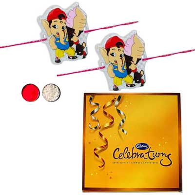 Bal Ganesh Kids Rakhi - KID-7020 - (2 RAKHIS) + Cadburys Celebrations chocolates box 170 gms + Free Roli and ChawalNote: Image shown is indicative. Same or Similar Rakhi will be delivered depending on stock