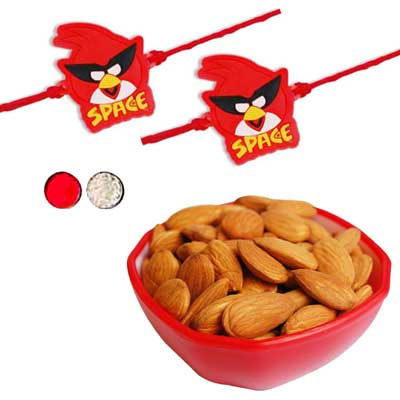 Red Space Bird Kids Rakhi - KID-7050 - (2 RAKHIS) + Badam in Plastic Bowl - 180gms (including bowl)+ Free Roli and Chawal. Note: Image shown is indicative. Same or Similar Rakhi will be delivered depending on stock