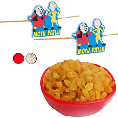 Motu Patlu Kids Rakhi - KID-7160 - (2 RAKHIS) + Kismis in Plastic Bowl - 200gms (including bowl)+ Free Roli and Chawal. Note: Image shown is indicative. Same or Similar Rakhi will be delivered depending on stock