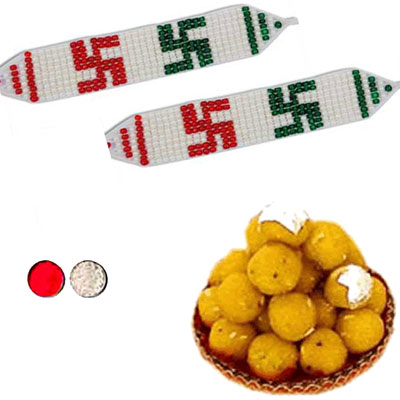 Zardosi Rakhi - ZR-5120 - (2 RAKHIS) +500gms of Laddu Sweets + Free Roli and chawal. Note: Image shown is indicative. Same or Similar Rakhi will be delivered depending on stock
