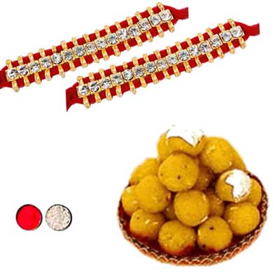 Single Line Stone Studded Rakhi - SR-9160 - (2 RAKHIS) + 500gms of Laddu Sweet + Free Roli and Chawal. Note: Image shown is indicative. Same or Similar Rakhi will be delivered depending on stock