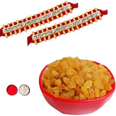 Single Line Stone Studded Rakhi - SR-9160 - (2 RAKHIS) + Kismis in Plastic Bowl - 200gms (including bowl)+ Free Roli and Chawal. Note: Image shown is indicative. Same or Similar Rakhi will be delivered depending on stock