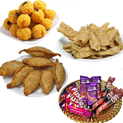 Abhiruchi Swagruha ChethiPakodi - 500gms + Abhiruchi Swagruha Kajjikayalu - 500gms + Laddu sweet - 500gms + Cadburys Dairy Milk Silk Fruit and Nut chocolates -3 bars + Vip Chocolates -3 bars + Caddburys Fuse chocolates -3 bars + Fancy gold coated Tray