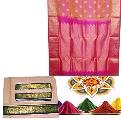 Exclusive Venkatagiri Pattu Saree - HSNM-2 + Sandalwood color Dhoti and angavastram with double Zari boarder. + Any 5 colours for Rangoli NOTE: Same day Delivery for Hyderabad and Secunderabad. For other places requires minimum 2 to 3 WORKING DAYS.