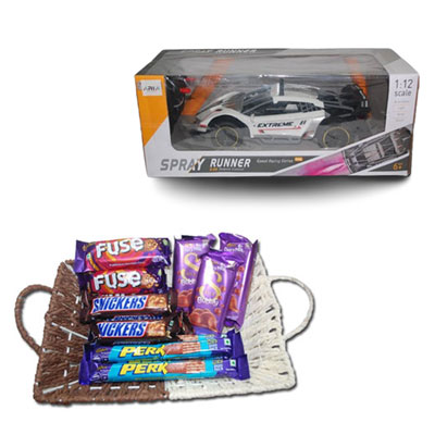 Spray Runner - White- (Remote Control) 2.4 G Remote Control , Auto Demo, Light. Spray, Sound + Cadbury Bubbly silk chocolates - 3 bars + Fuse chocolates -3 bars + Snickers -3 bars + Perk chocolates -5 bars + colour thread basket Choco Thali - code RC04. NOTE: Same day Delivery for Hyderabad and Secunderabad. For other places requires minimum 2 to 3 WORKING DAYS.
