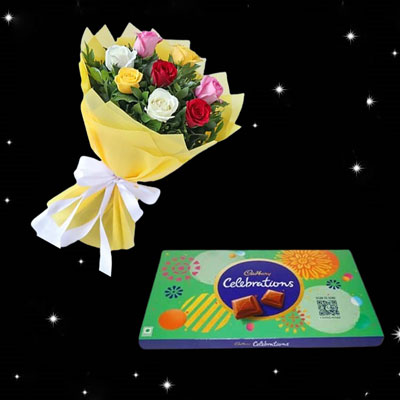 Beautiful Flower Bouquet with 15 Mixed Roses wrapped in a decorative paper with bow. + Cadbury Celebrations Chocolates - Weight 154.2gms Note: Deliveries only in Available Cities. ... View more details given in more information.
