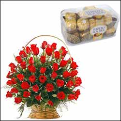 This hamper consists of Ferrero Rocher 16 pieces chocolates in a box+ 30 red roses flower arrangement