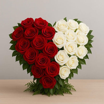 Beautiful Heart shape Flower arrangement with 12 Red and 12 White Roses.