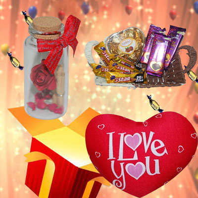 Celebrate special occasions by giving a thrilling surprise to your dear one with a gift which is hidden in the following way. Heart Shape Pillow with message - PST -735 Size :13CM*10 CM + Dairy milk silk chocolates -3 bars + Heart shape kaprika 5 pieces chocolate box + 5 star chocolates -5 bars + Thread basket with handle + Message Bottle with Predefine Message -1302 is hidden in a Gift Box and packed as a single Gift.