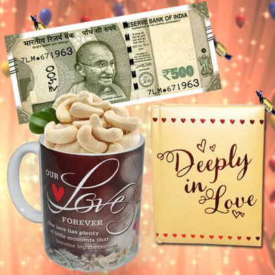 Celebrate special occasions by giving a thrilling surprise to your dear one with a gift which is hidden in the following way. Cash Rs 500/- + Deeply in Love Miniature quotes book-004 is hidden in a Love Mug along with Kaju dryfruit and packed as a single Gift. NOTE: Same day Delivery for Hyderabad and Secunderabad. For other places requires minimum 2 to 3 WORKING DAYS.