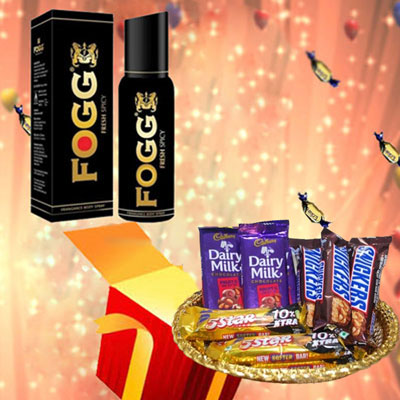 Celebrate special occasions by giving a thrilling surprise to your dear one with a gift which is hidden in the following way. Fogg Perfume for men - Fresh Spicy + Dairy Milk Fruit and Nut chocolates - 3 bars + Snickers chocolates - 3 bars + 5Star chocolates - 5 bars + Gold colour tray. Choco Thali - code RC07 is hidden in a Gift Box and packed as a single Gift.