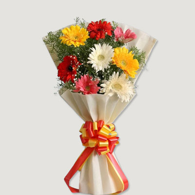 Beautiful Flower Bouquet with 10 mixed Gerberas along with fillers. Note: Deliveries only in Available Cities.